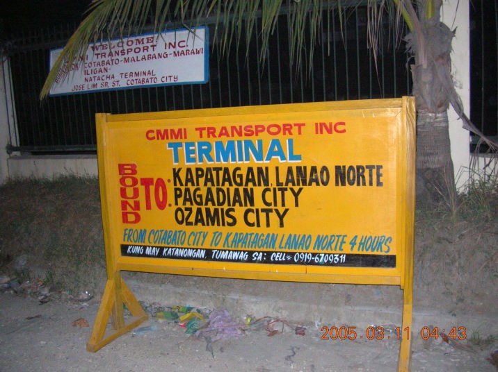 カミトランスポート社のカパタガン行き、パガデイアン行き、オザミズ行きのあるコタバトジプニーターミナル前 |